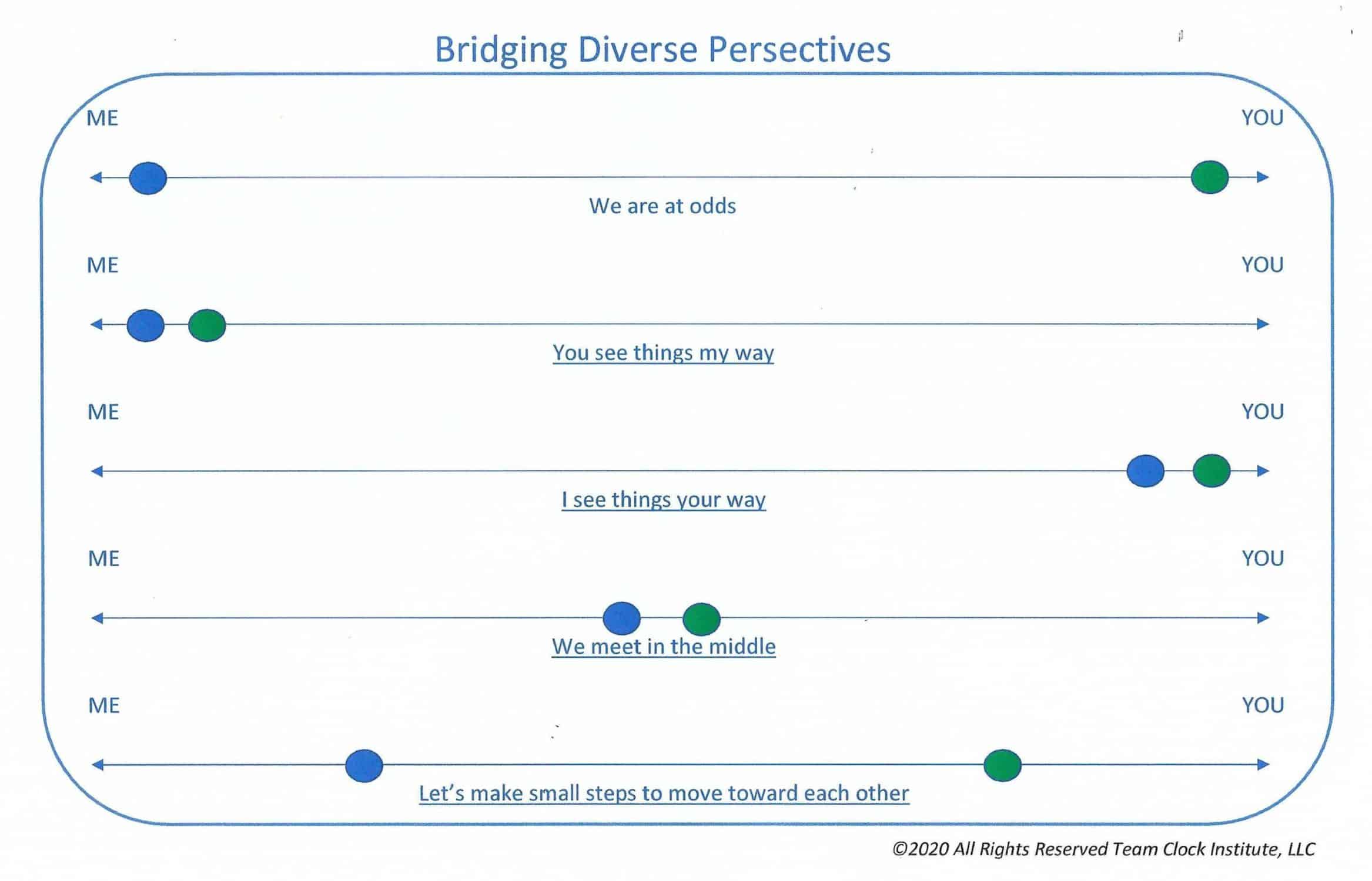 Now, examine each relationship on the team as a negotiation of perspective sharing where the objective is simply understanding. You don’t have to agree. You don’t have to compromise. You don’t have to see things my way. You just have to understand. Below are five ways to view differences in perspective.