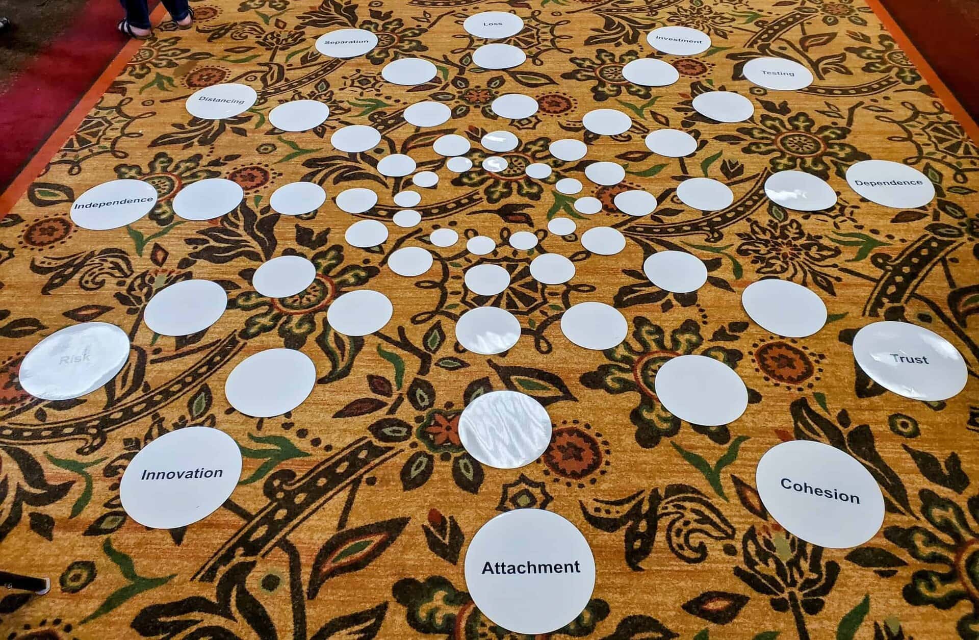 Step 1: Everyone stands on whatever dot on the floor model that best represents their current challenge. Each teammate then answers the question, “Where are you on the cycle and why are you there?”